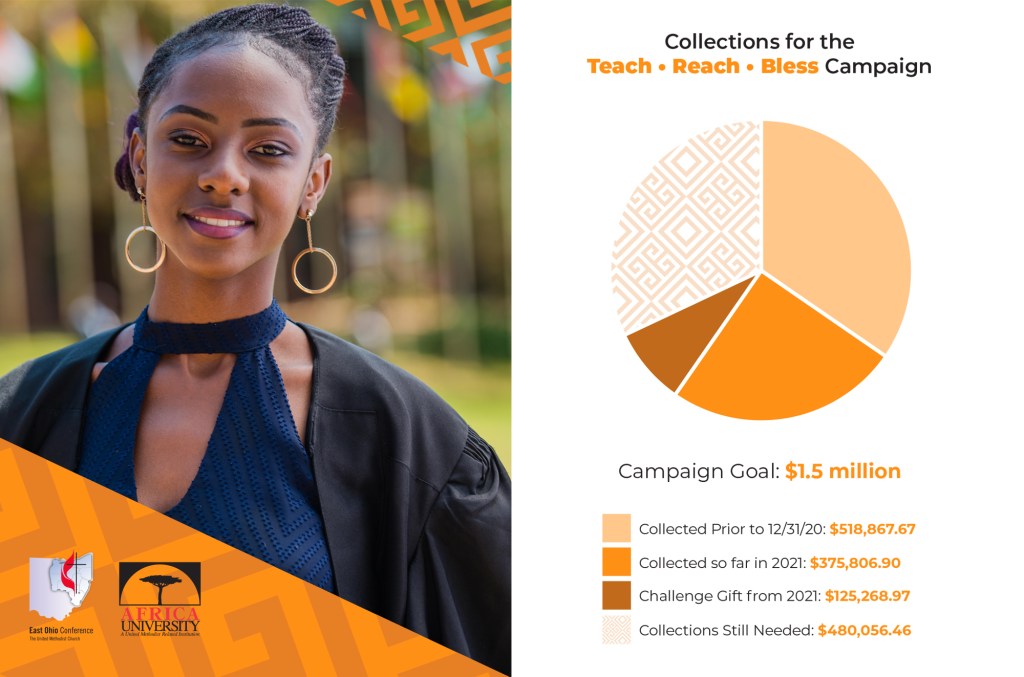 The East Ohio Conference has made a commitment to raise $1.5 million through the Teach • Reach • Bless campaign to build a new dormitory for female students at Africa University. The campaign needs to collect $480,056.46 to have the needed $1.5 million in hand so that ground can be broken to build the dormitory.