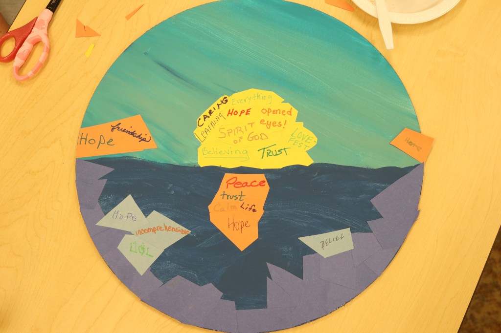 “Faith is the foundation on which everything is built, so how do we sum it up? What image comes to mind when you think of faith?” A lake came to her mind, so she had painted the surface of a lake meeting the sky. Everyone present was invited to write down what faith meant to them in one word or a few words, and Rebecca would take those papers and add them to the painting as the sunrise or sunset.
