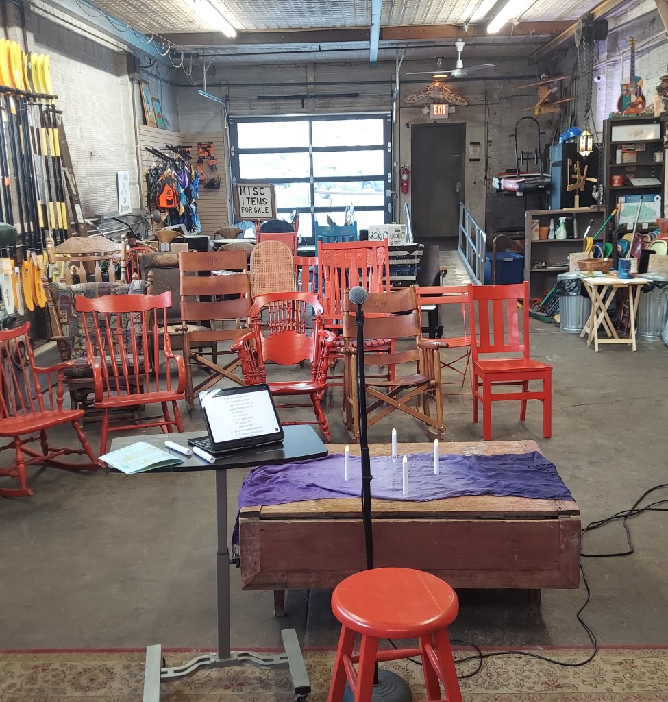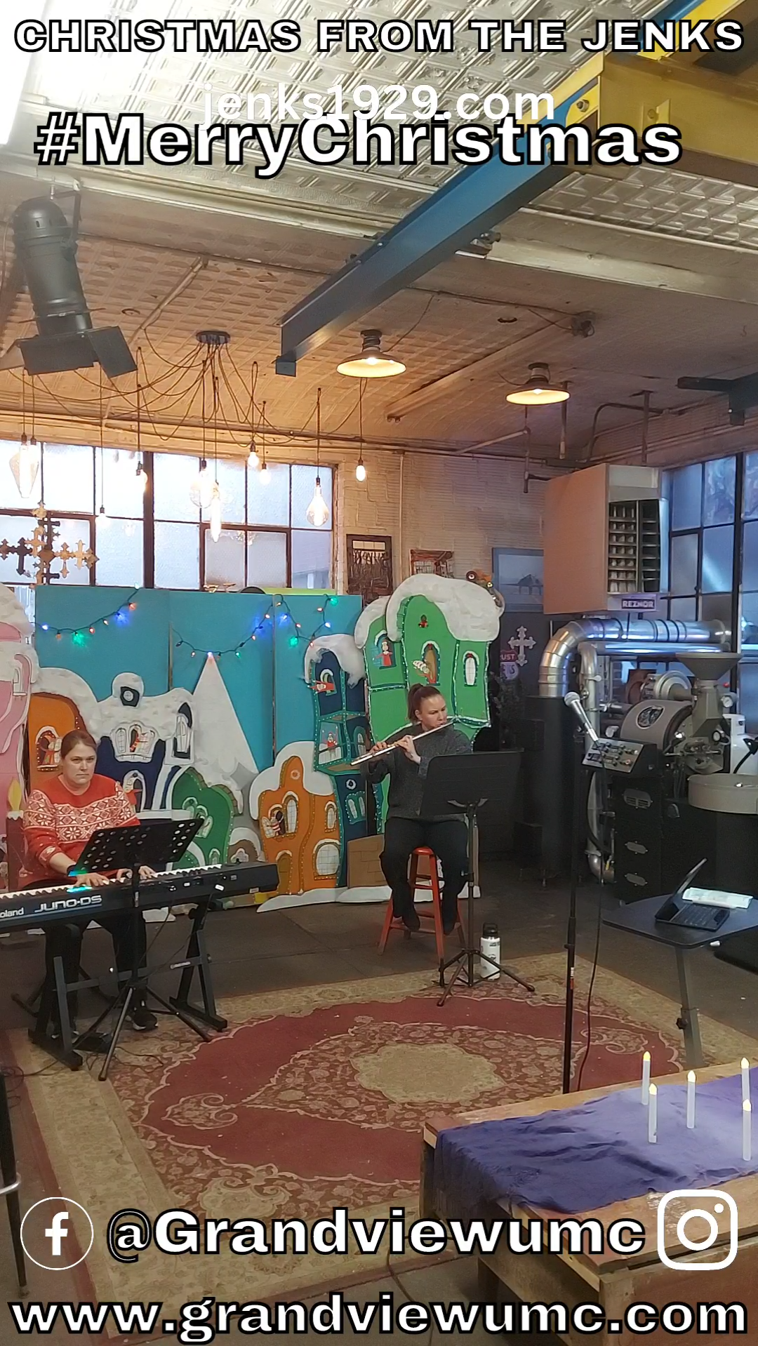 Grandview UMC church member and co-owner with her husband of the Largely Literary Theater Company Sara Showman attended the service in-person. “It was so wonderful that I could truly find the spirit of Christ and Christmas in a refurbished garage in downtown Cuyahoga Falls. And that was because ‘two or more were gathered in His name’ to worship with beautiful music, warm camaraderie and a church community that can be found anywhere as long as Jesus is there, too.”