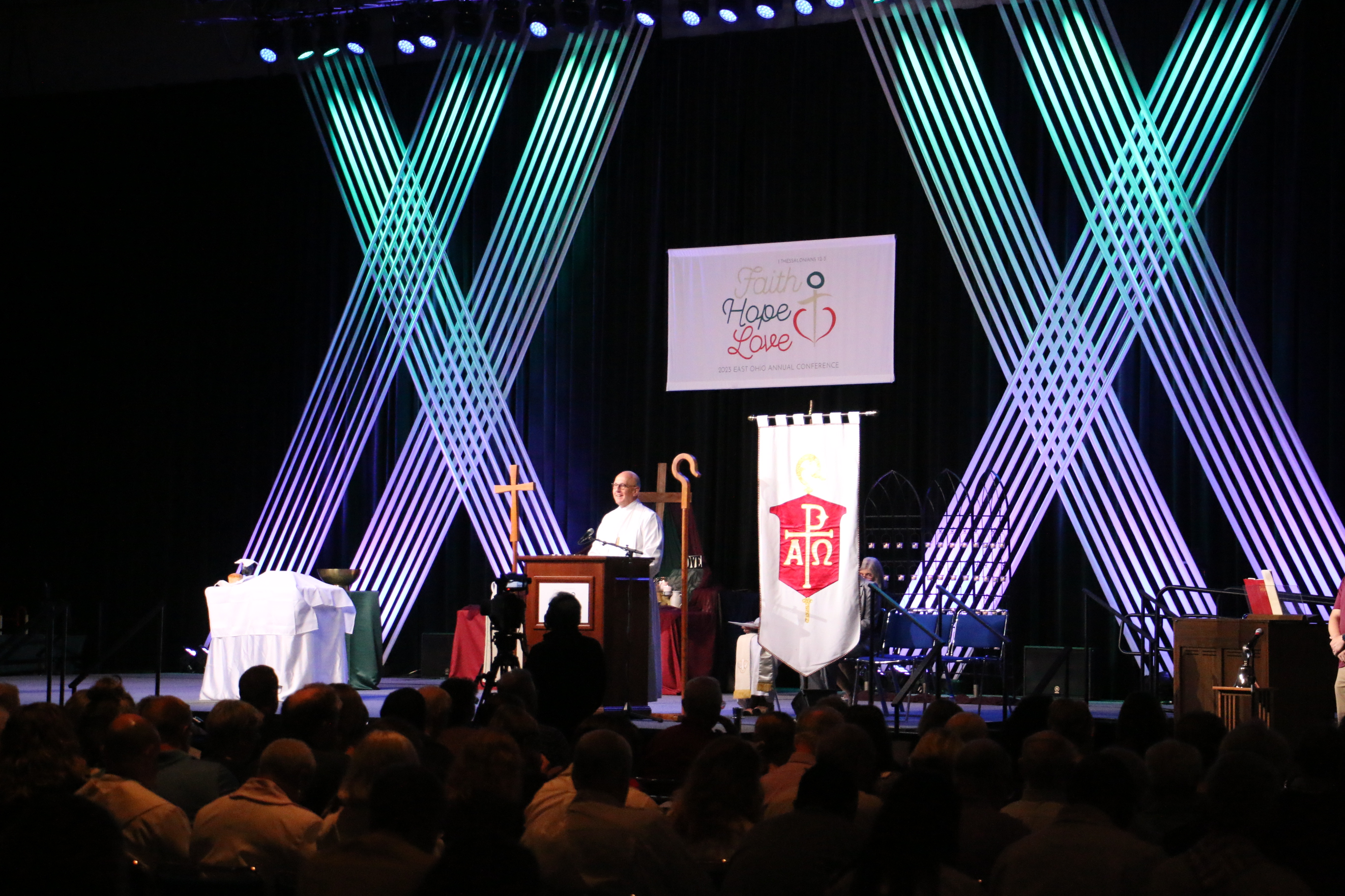 For the first time since 2019, the year before the pandemic, communion was served via intinction during worship and the offering plate was passed among Annual Conference members, instead of the offering being received only online. This year’s offering will benefit EOC Volunteers in Mission, Heart 4 the City in Akron, and the Bishop’s Discretionary Fund.
