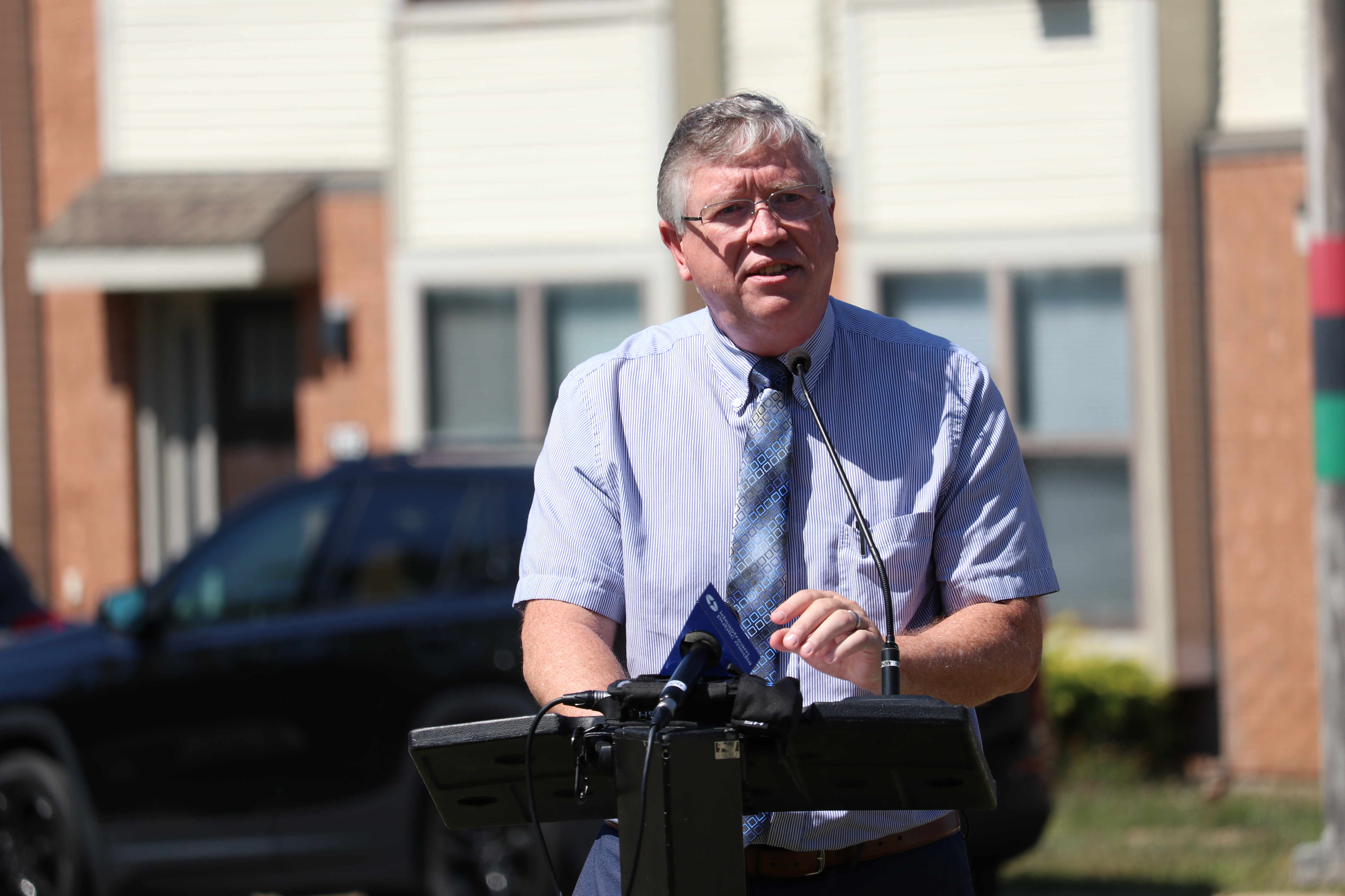 A crowd of city officials and residents gathered at the location where the Seventy-Niners Café once stood. Occasionally drivers would honk their horns in enthusiasm at the proceedings and pedestrians walking by would stop to listen to what was being shared from the microphone.