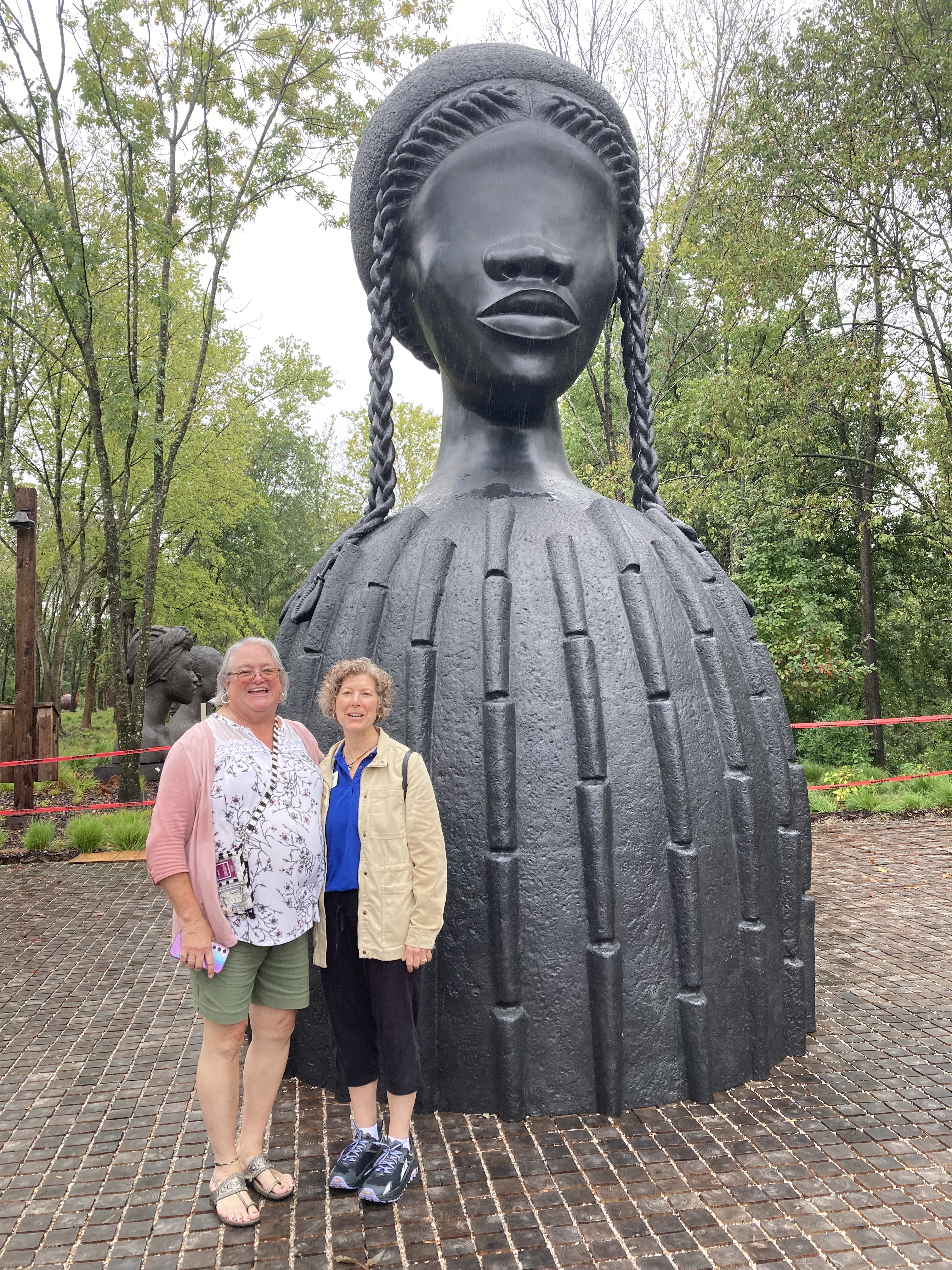 Day two of the tour took us to the outdoor Freedom Monument Sculpture Park along the Alabama River. Its location reminds visitors that because of its proximity to the Alabama River, the slave trade led to Montgomery’s thriving. The enslaved built the railroad to expedite the slave trade, facilitating future enslaved persons chained together, jammed into railroad cars, and transported to auction blocks in the center of the city. Trafficked Africans were treated like cattle and sold. Enslaved families were separated and likely never found each other again. The slave trade fueled the economy in Montogomery as well as other major cities including Charleston, New York City, Richmond, Boston, New Orleans, Newport, Wilmington, and Savannah. The Legacy Museum and the Freedom Monument Sculpture Park are located where Montgomery’s slave market and slave warehouse once stood.