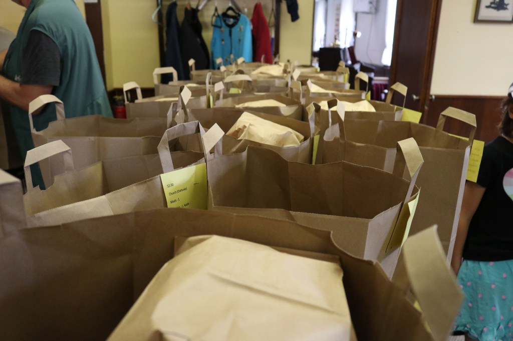 “We used to have people come into this room here,” shared Pat Simons, gesturing around the church fellowship hall. “We would sit 54 people in that room for all those years and then COVID came and so we’ve gone completely take-out, and it is so much easier.”