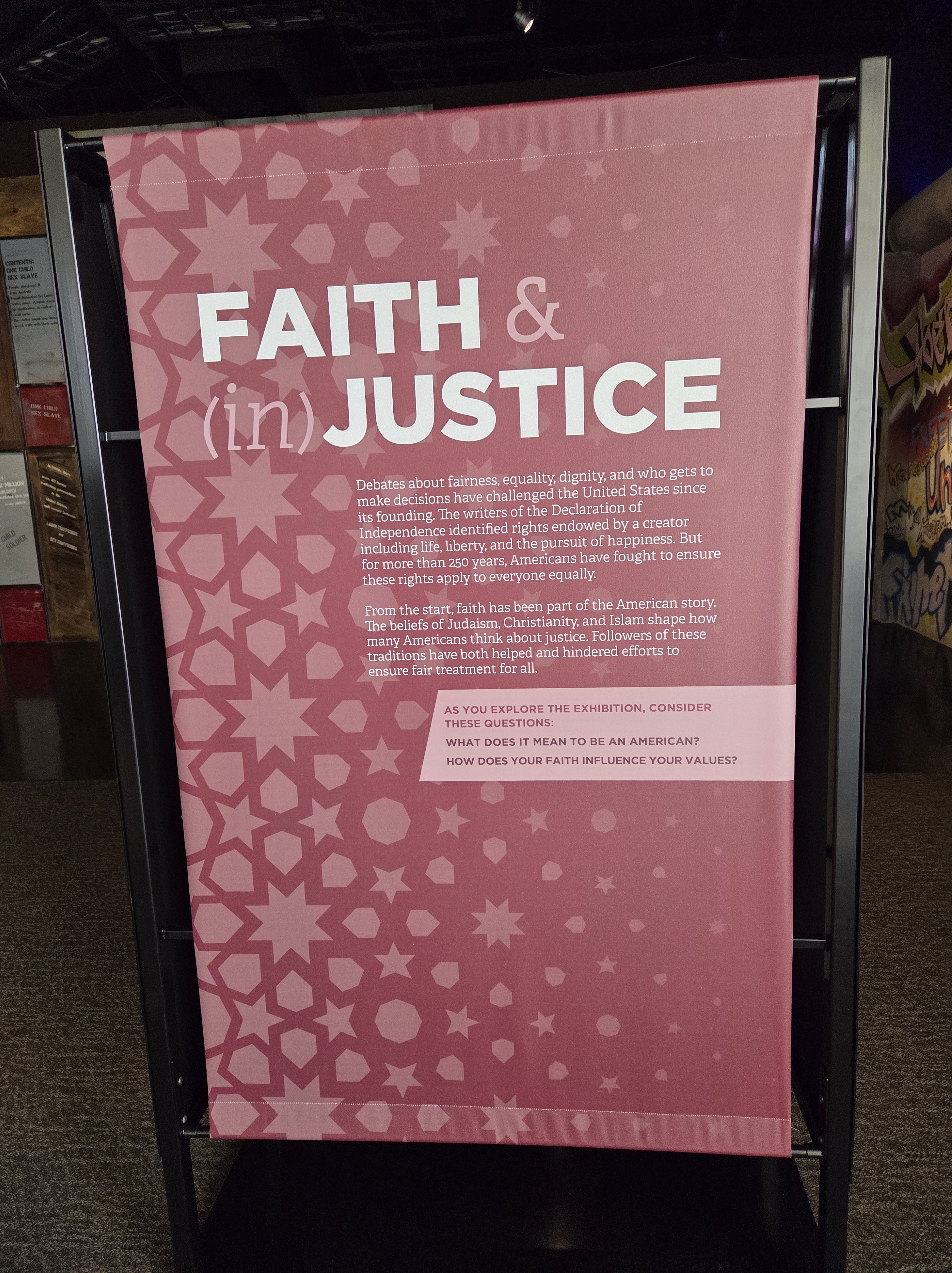 One of the day’s most impactful experiences was the special exhibit titled Faith & (in)Justice. Running through December 2025, the exhibit explores how religious traditions – particularly Christianity, Judaism, and Islam – have shaped America’s understanding of justice and injustice. The exhibit does not shy away from the contradictions: scripture used to justify enslavement, clergy who marched for justice, congregations that resisted desegregation, and believers who chose courageous compassion.